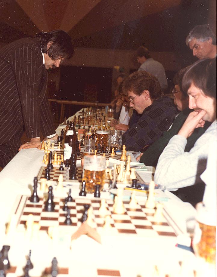 Schach spiele ich schon sehr lange, mal intensiver, mal weniger intensiv. Das folgende Bild zeigt mich in den frühen achtziger Jahren (!) bei einer Simultanpartie gegen den tschechischen Großmeister und Weltmeisterschaftskandidaten Vlastimil Hort. Ich lebte damals in Stuttgart und war als Gründungsmitglied mehrere Jahre in einem nahegelegenen Stuttgarter Schachverein aktiv, auch als Mannschaftsspieler. Zum Ergebnis nur soviel: Ich habe verloren, habe ihn allerdings ziemlich lange beschäftigt (zum Schluss standen viele der anderen Spieler um unser Brett herum; na ja, die Sensation lag in der Luft, aber sie blieb letztlich doch aus...)