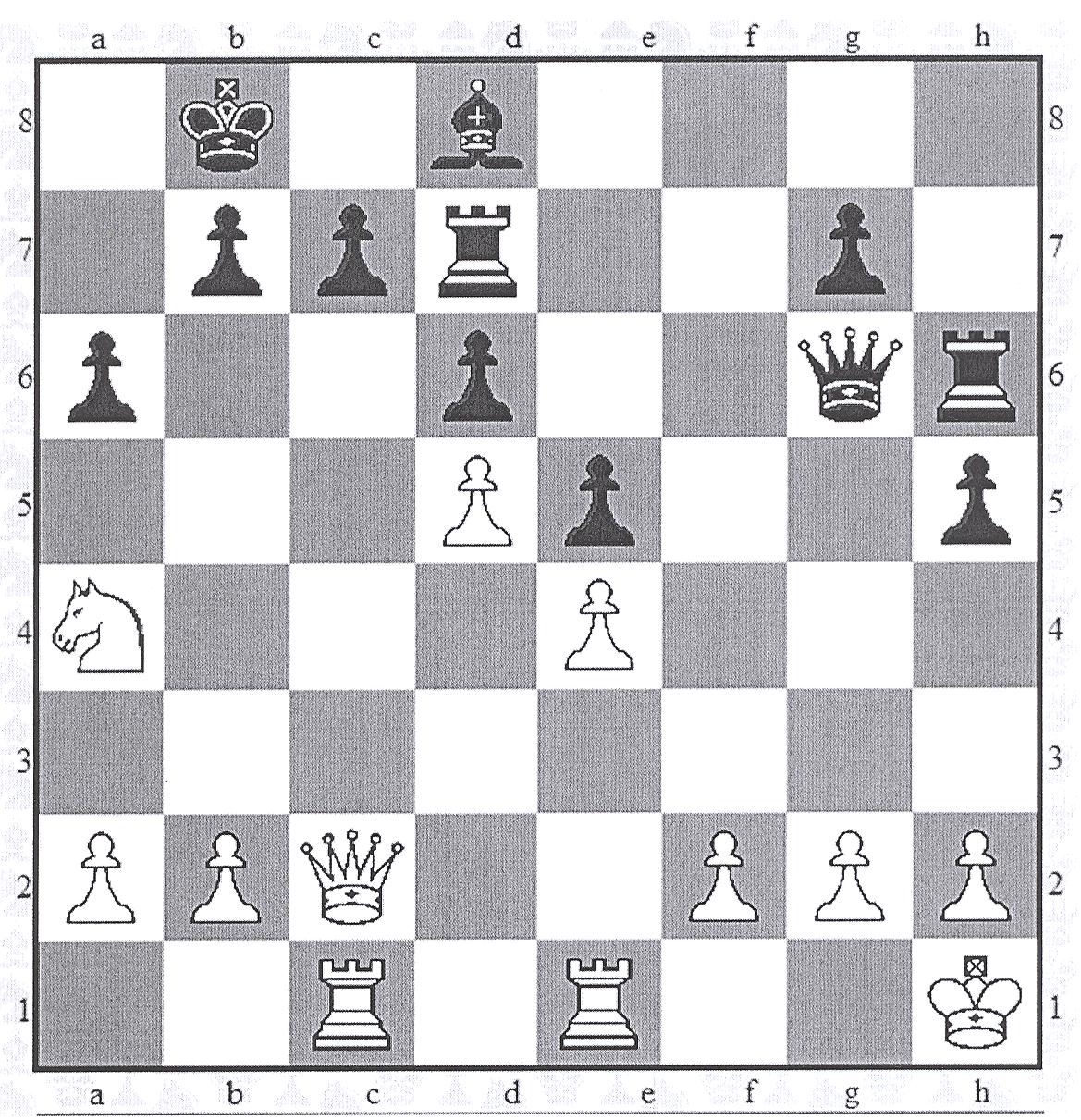 20.Sb6! Tf7 21.Te3 Lg5 22.Da4 Th8 23.Sd7 Txd7 24.Dxd7 Tc8 25.Tg3 h4 26.Tg4 Df6 27.Tc2 Lh6 28.a4 g5 29.b4 c6 30.dxc6 Txc6 31.Txc6 bxc6 32.f3 d5 33.Df5 Dd6 34.exd5 Dxd5 35.Dc2 h3 36.Tc4 hxg2 37.Kxg2 g4 38.Txg4 Lf4 39.Tg6 e4 40.fxe4 Dd7 41.Df2 Dd2 42.Dxd2 Lxd2 43.Txc6 Kb7 44.Tc4 und Schwarz gab die hoffnungslos stehende Partie auf.